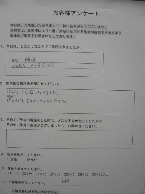 弥冨市在住・肩こり・腰痛で来院された30歳代の女性の声